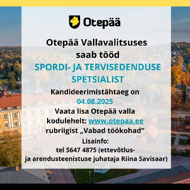 Kandideerimiseks saata hiljemalt 04.08.2025 oma sooviavaldus, CV, motivatsioonikiri ja haridust tõendavate dokumentide koopiad e-posti aadressile: vald@otepaa.ee