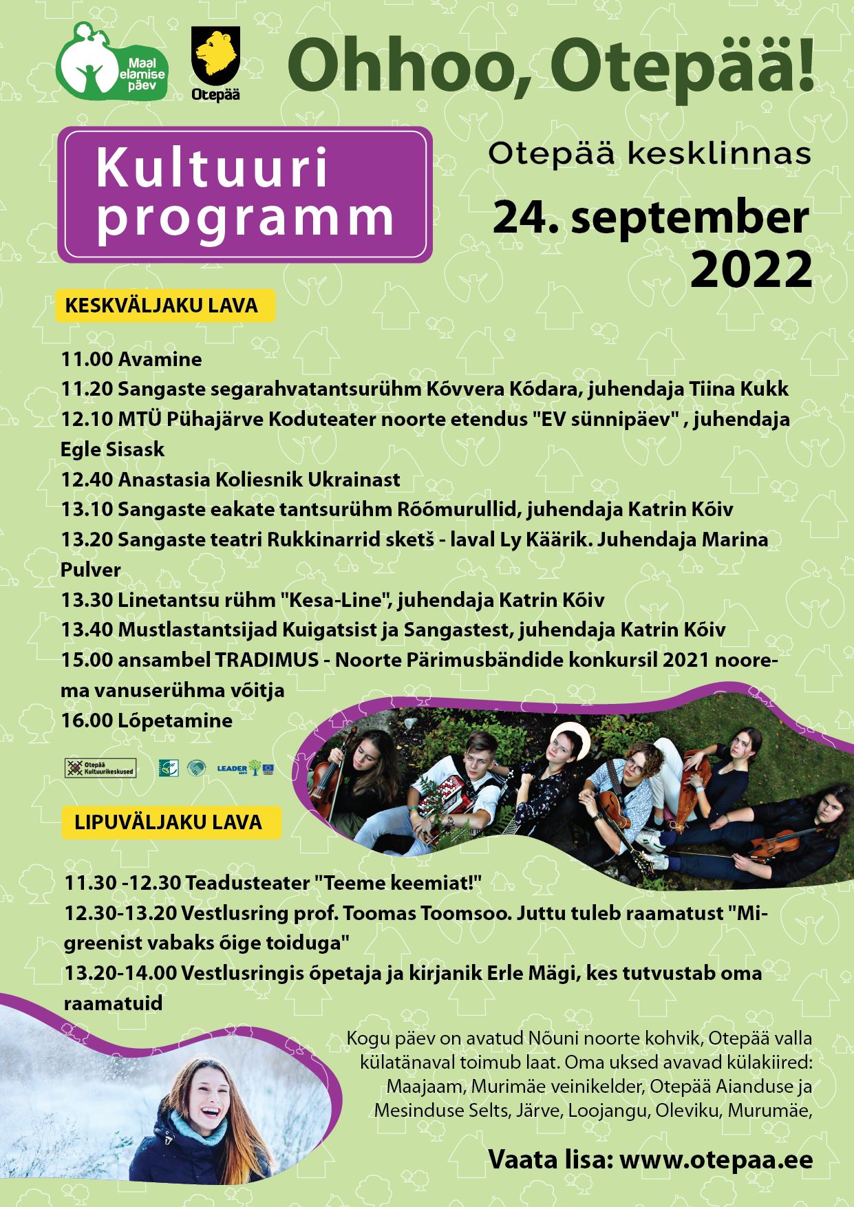 24. septembril 2022 kell 11.00-16.00 toimub Otepää keskväljakul üleriigilise Maal elamise päeva raames sündmus „OHHOO, OTEPÄÄ!".