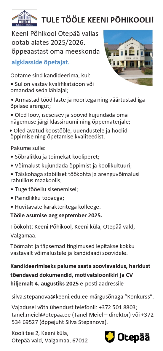 Keeni Põhikool otsib oma meeskonda klassiõpetajat (konkurss lõppenud)