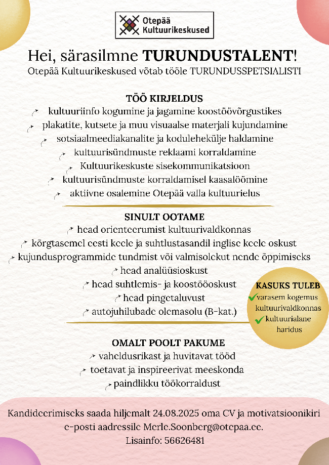 Kandideerimiseks saada hiljemalt 25.08.2025 oma CV ja motivatsioonikiri e-posti aadressile merle.soonberg@otepaa.ee. Lisainfo: 5662 6481