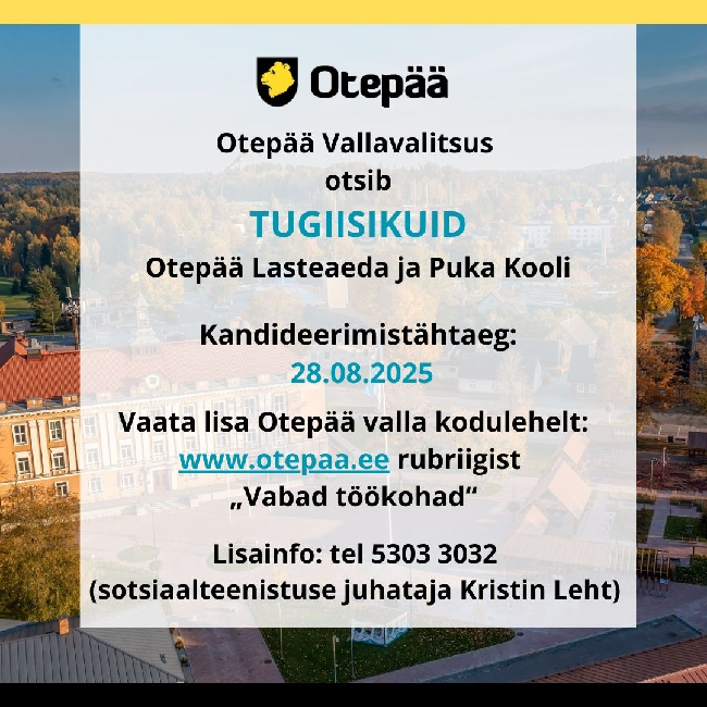 Kandideerimiseks saada oma CV Otepää Vallavalitsuse e-posti aadressile: kristin.leht@otepaa.ee hiljemalt 28.08.2025